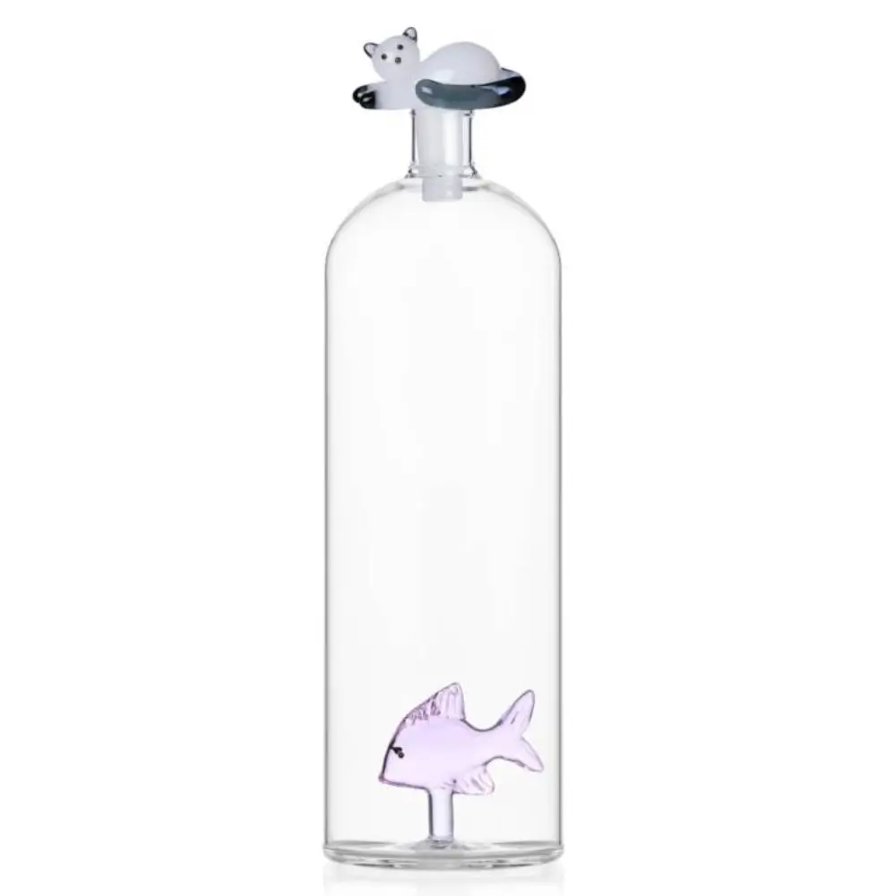 Esta botella de Ichendorf está formada en vidrio borosilicato hecho a mano y trabajado con lámpara, un material elegido por su claridad, ligereza y resistencia excepcional a las variaciones de temperatura. Esta artesanía da lugar a volúmenes sutiles y bordes limpios, permitiendo que las figuras en miniatura en su interior parezcan suspendidas como si estuvieran capturadas en un momento de suave quietud. Las características de la colección Tabby Cat especifican su idoneidad para uso alimentario y ciclos de lavavajillas a baja temperatura, aunque la precisión de sus elementos internos aconseja un manejo cuidadoso. Cada detalle, desde el suave tono rosa del pez hasta el gato blanco posado en su interior, revela la precisión y el encanto típicos del lenguaje imaginativo de Baldereschi.