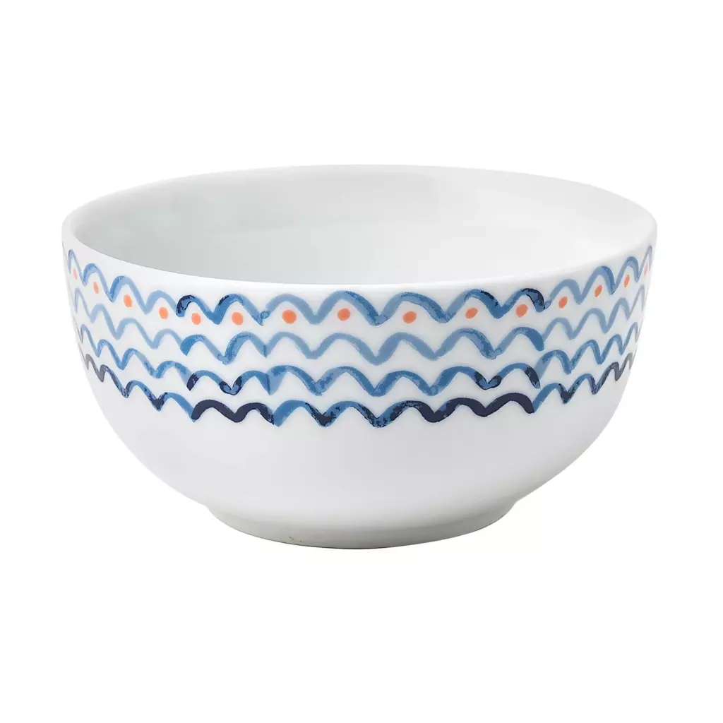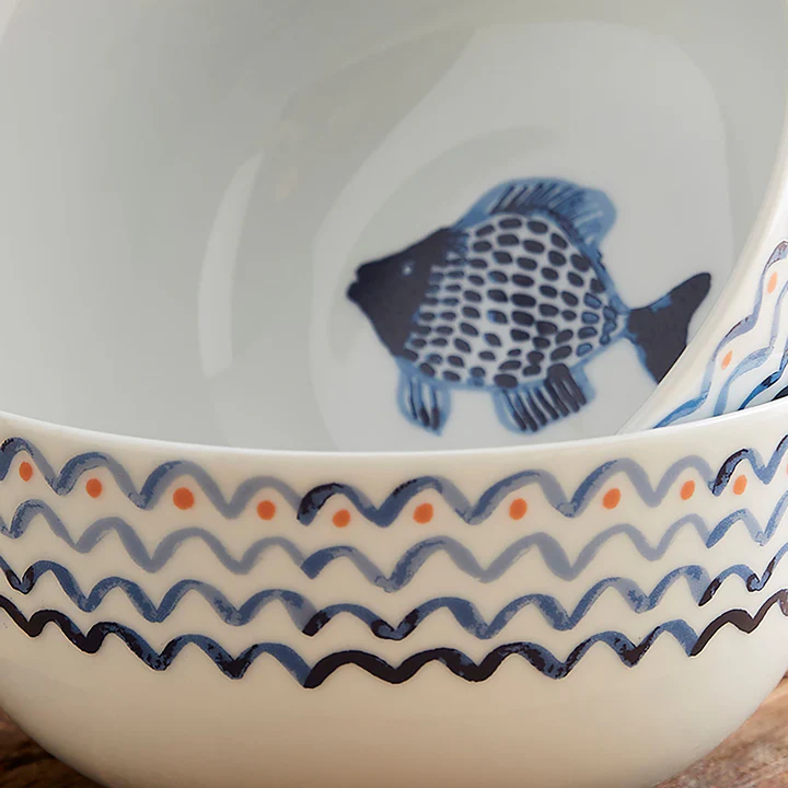 Esta colección de cocina, inspirada en el auge de la natación y la pesca en el mar, lleva el poder calmante del océano a tu hogar. Pintada a mano con acuarelas, sus sencillos dibujos lineales y patrones sueltos reflejan los azules oscuros del Atlántico y las ondas del océano. Un toque moderno a la paleta náutica añade el coral, creando un diseño fresco y contemporáneo con un aire costero y relajante.