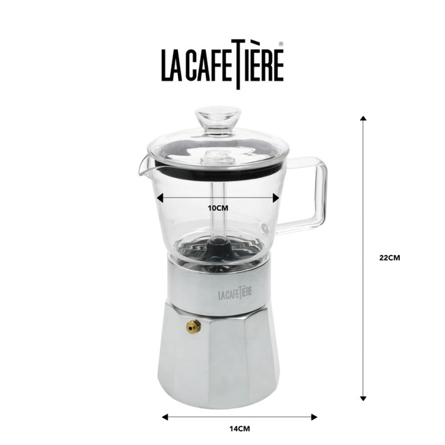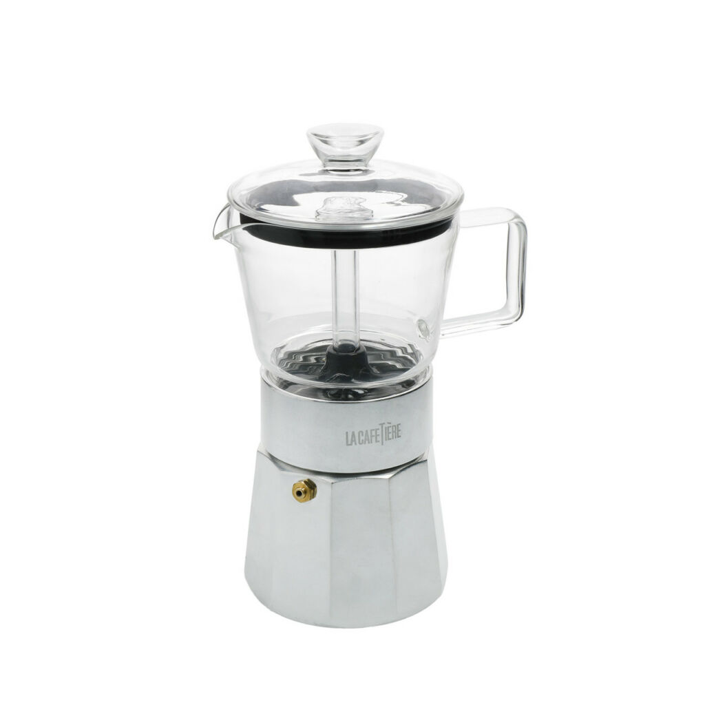 Esta máquina de café espresso de 6 tazas Verona de La Cafetière revisita el diseño clásico italiano, con un toque diferente. Al incorporar vidrio de borosilicato resistente al calor en la parte superior de la olla, esta innovación inteligente permite al usuario ver la burbuja de café y prepararse. Hecha de acero inoxidable duradero, la máquina de café espresso es adecuada para todas las fuentes de calor, incluidas las placas de inducción, de gas tradicionales, eléctricas y de cerámica. El mango y la perilla siempre permanecen fríos al tacto, lo que hace que el vertido sea seguro y cómodo. Para usar, llene la base con agua justo debajo de la válvula, agregue café molido al embudo, luego ensamble y caliente hasta que la sección superior esté llena. Disponible en cinco combinaciones de colores de tendencia para adaptarse a cualquier hogar: rojo; Café con leche; Verde; Negro; y plata.
