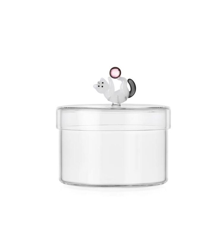 Esta caja bombonera es una pieza de vidrio de borosilicato, soplada a boca y hecha a mano. El diseño, característico de la colección Tabby Cat de Alessandra Baldereschi, está inspirado en la figura de un gato doméstico. La pieza consiste en una caja o recipiente cilíndrico con una tapa de vidrio transparente que incluye una figura de gato y una pelota rosa integradas en el diseño, ofreciendo un toque que caracteriza a las creaciones de la diseñadora.
