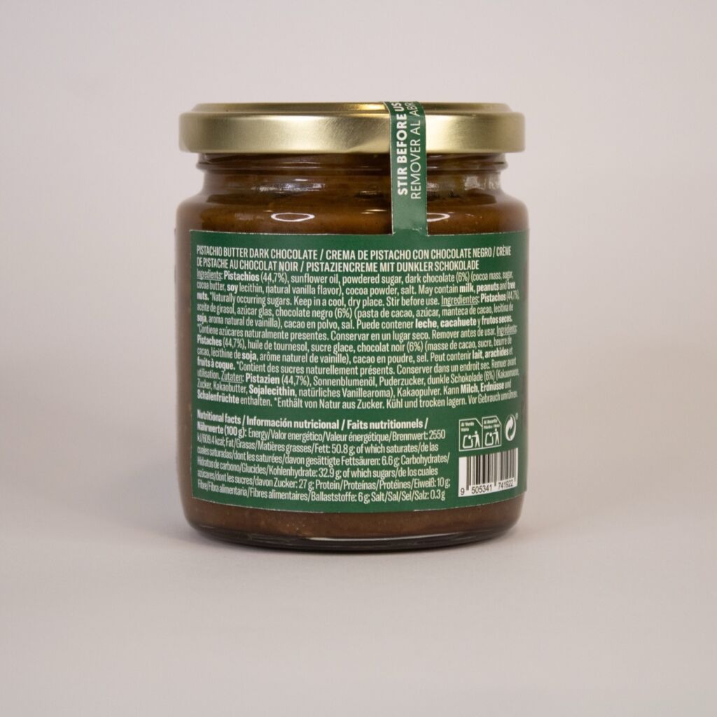 Chocolate negro y pistacho: ¡una combinación celestial! Suave crema de pistacho con chocolate negro, elaborada artesanalmente con pistachos molidos de textura sedosa y chocolate negro de primera calidad (70 % de cacao). Elaborada en pequeños lotes con pistachos tostados en seco de origen local y una pizca de sal marina orgánica.
