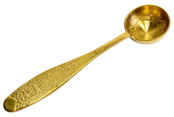Cuchara de acero inoxidable con patrón estampado y revestimiento PVD dorado.