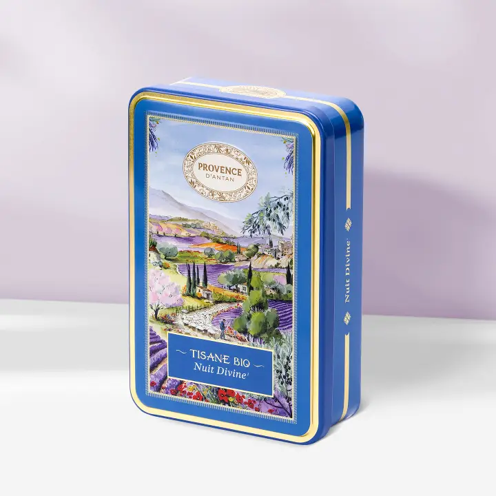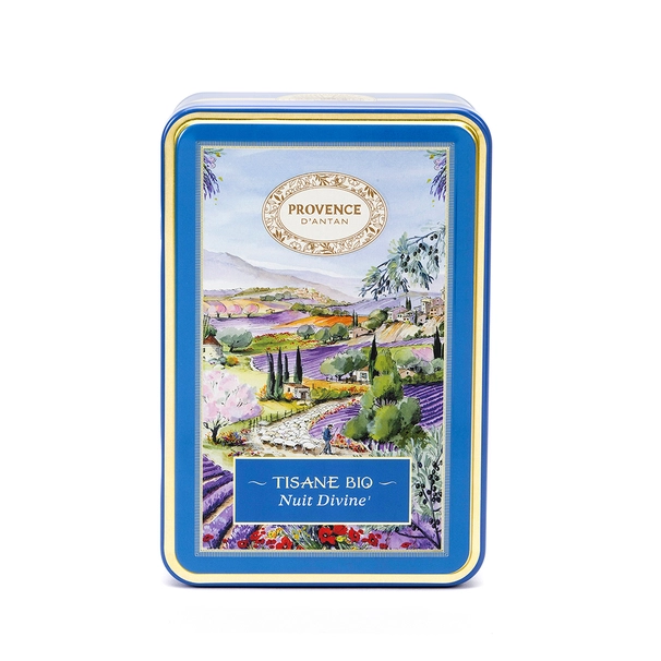 Tisana Bio Noche Divina – Serenidad y Suavidad Regálate una noche tranquila gracias a esta delicada infusión, con notas florales y afrutadas, pensada para calmar el cuerpo y mente antes de dormir. La melisa contribuye a mantener un buen sueño, la verbena fragante favorece la calma, la mejorana añade un toque floral y el naranjo aporta suavidad y confort. Cada taza despliega una armonía de sabores cítricos, afrutados y vegetales, para un final sutilmente envolvente. Para saborear por la noche en un ritual de relajación o al final de una comida, esta tisana se convierte en tu aliada de bienestar. Elaborada en Francia a partir de plantas de agricultura ecológica, sin aromas artificiales, está envasada en una elegante y reutilizable caja de metal. Fiel al espíritu de la Provenza de antaño, Noche Divina conjuga naturalidad, saber hacer y compromiso eco-responsable para transformar tus noches en momentos de serenidad.