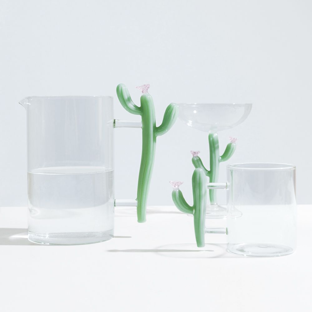 Jarra de diseño con asa en forma de cactus en color verde mate y una flor rosa,