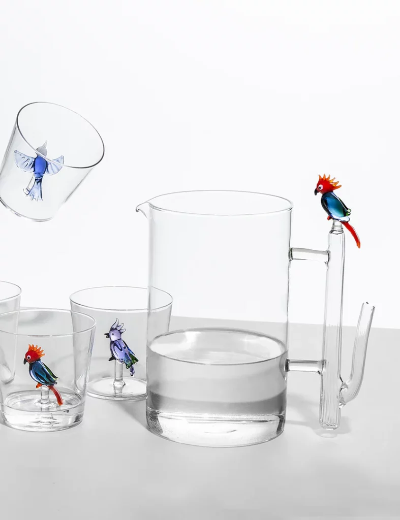 Inspirada en la vida de los árboles y en la interacción entre aves y vegetación, cada vaso, jarra y recipiente de la colección Talking Trees fusiona el cristal transparente con delicadas figuras de pájaros, ramas y copas de árbol, recreando escenas poéticas y llenas de vida.