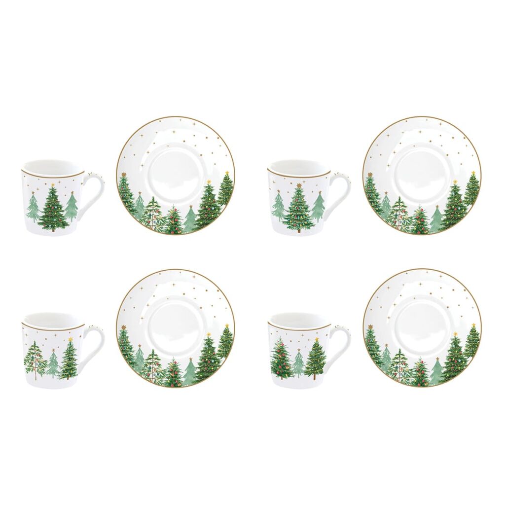 Juego de 4 tazas de café con platillo con diseño de abetos de navidad