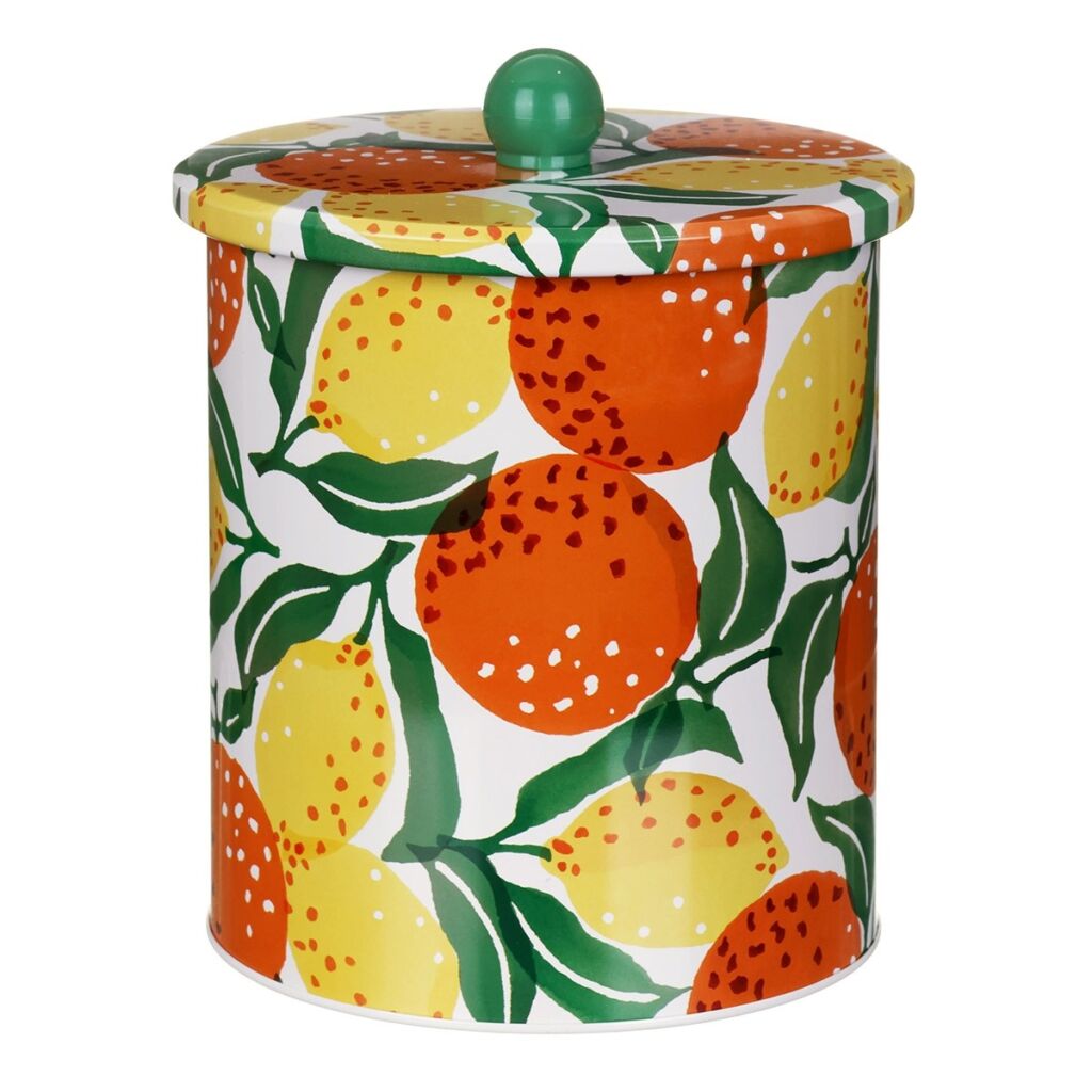 Esta lata cilíndrica está decorada con un diseño clásico de esponja. Esta refrescante lata captura jugosas naranjas y cítricos limones amarillos, cada uno con motas y hojas de un verde intenso que contrastan con los suntuosos cítricos. Con un fondo crema, sus colores veraniegos y su alegre carácter, sin duda te sacará una sonrisa.