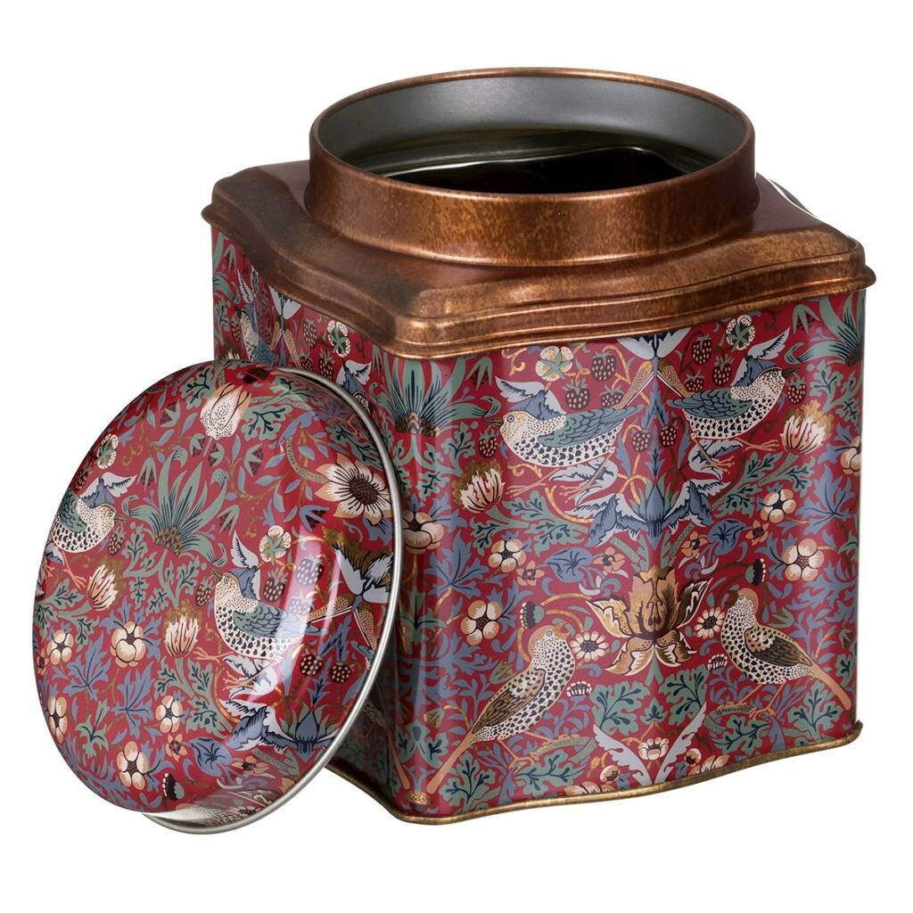 Decorado con el diseño del Ladrón de Fresas, presenta un pájaro entre follaje y flores comiendo fresas. El estampado se presenta en tonos verdes apagados sobre un fondo rojo, con detalles en cobre que le aportan un toque rústico.