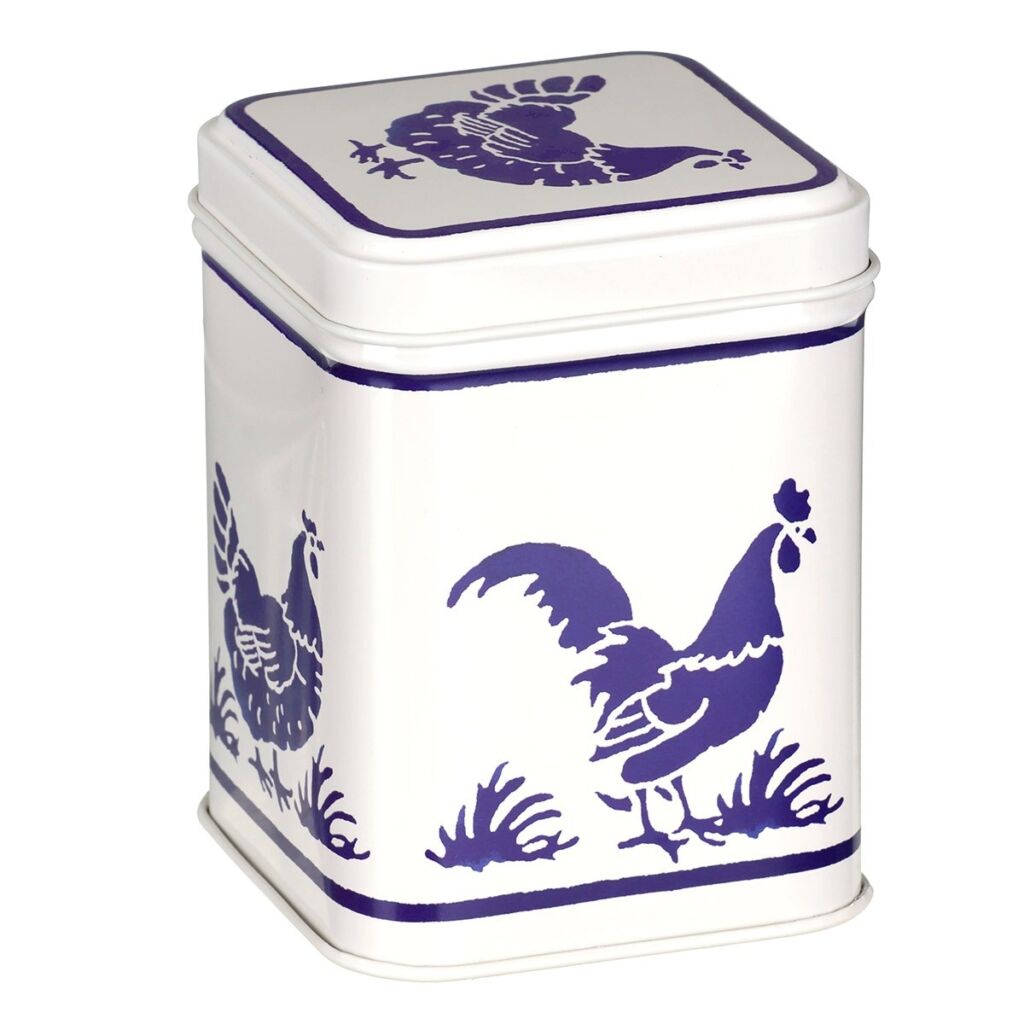 La lata metálica está adornada con un estampado de gallinas en esponja azul. En el borde, un alegre desfile de gallinas y un gallo se intercala con matas de hierba, como si se pavonearan por un campo, uno en cada cara, incluida la tapa. Sobre un fondo crema, el diseño azul resulta impactante y añade un toque de encanto rural a tu hogar.