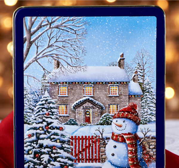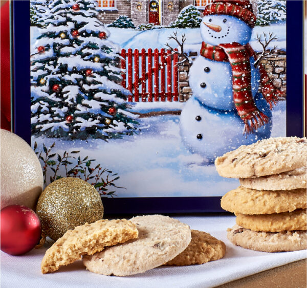 Esta lata de galletas, decorada con una pintoresca escena de cabaña nevada, está llena de sabrosas galletas de jengibre y limón y ricas galletas de mantequilla con chispas de chocolate y crema cuajada, que ofrecen una deliciosa mezcla de sabores para la temporada festiva.