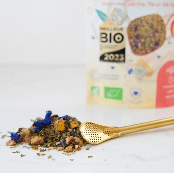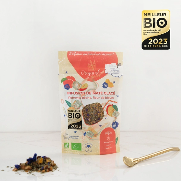 ¡El té helado esencial de melocotón reinterpretado al estilo Original Mate! Manténgase hidratado disfrutando de su té helado de mate, manzana, melocotón y flor de arándano durante el verano. El té de manzana y melocotón es una fuente de antioxidantes. Por su parte, el aciano, actuando en sinergia con el mate, estimulará la digestión. Una verdadera aliada del bienestar, esta infusión se puede tomar durante todo el día y sin moderación durante todo el verano. Infusión gourmet e hidratante, sin amargor y sin azúcar.
