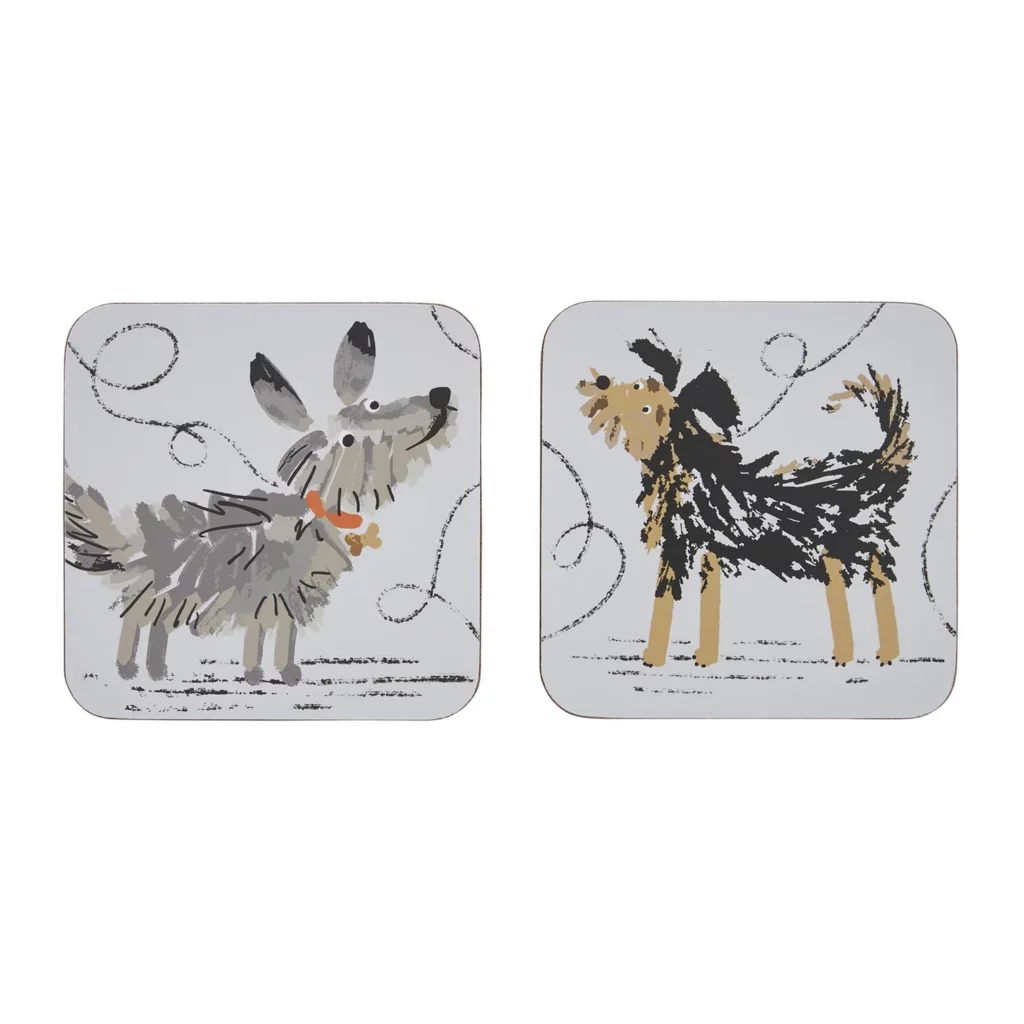 ¡Esta variopinto grupo de perritos juguetones tiene muchísima personalidad! El estilo de la ilustración se ha inspirado en los icónicos bocetos de Quentin Blake, con el uso de crayones negros ásperos y pinceladas ásperas de gouache. La emoción y la energía de estos cachorros irradian desde el diseño, y las correas enredadas que se extienden en espiral por todo el conjunto son un divertido telón de fondo. Puede que los perros estén desaliñados, pero la colección es absolutamente adorable
