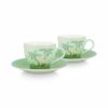 Este juego de taza y platillo de espresso verde te llevará de viaje a una isla tropical con su diseño tropical. Las tazas están decoradas con puntos dorados y tienen detalles azules. Los platillos están decorados con un diseño exótico. Aquí encontrará varias plantas, flores coloridas y especies. Este conjunto tiene el tamaño perfecto para una pequeña taza de café.
