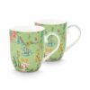 Un conjunto de dos tazas pequeñas de nuestra colección tropical Jolie. Estas hermosas tazas tienen un fondo verde con flores coloridas. Imagínese en una isla tropical y eche un vistazo a las plantas tropicales, decoradas en estas tazas. Perfecto para alegrar tu vajilla. Las asas de las tazas están decoradas con elegantes detalles azules. Combina estas tazas con otros artículos de porcelana de nuestra colección Jolie para un look hermoso.
