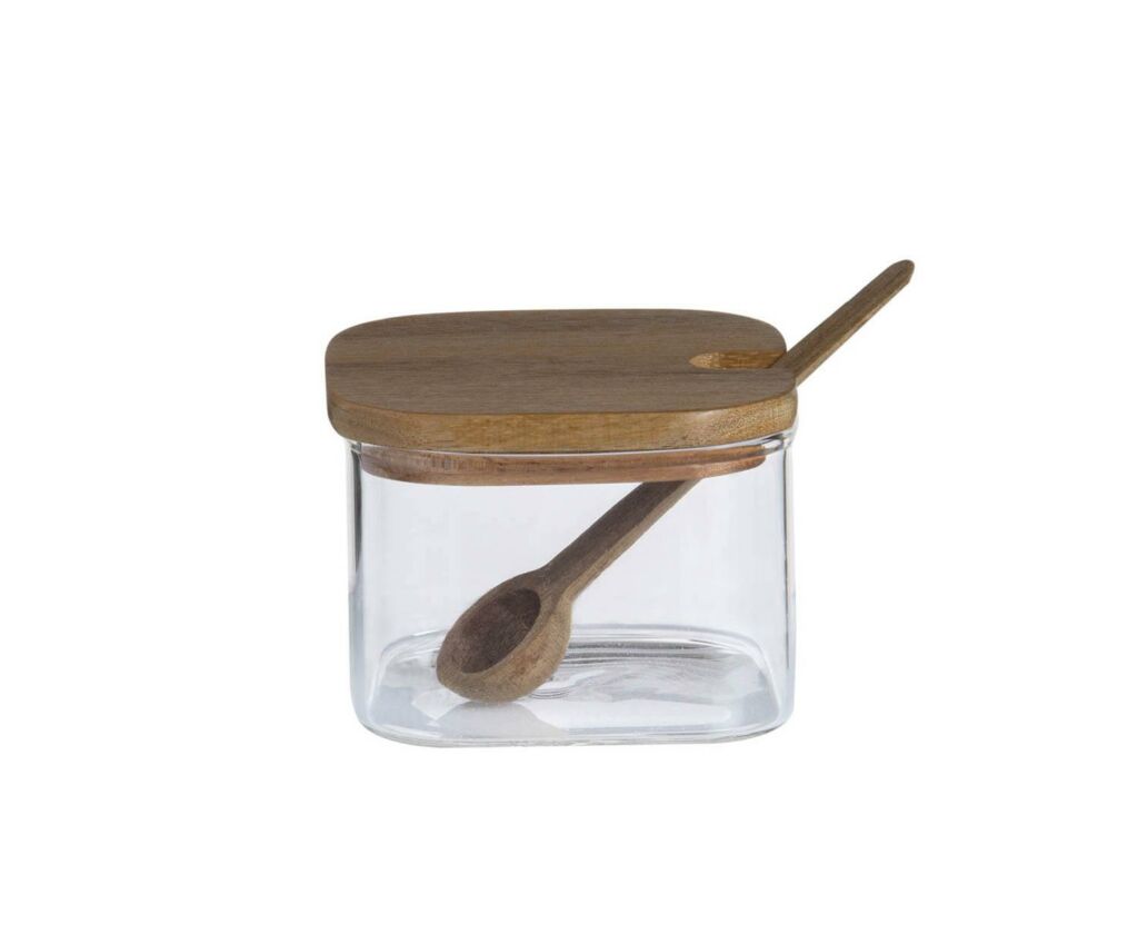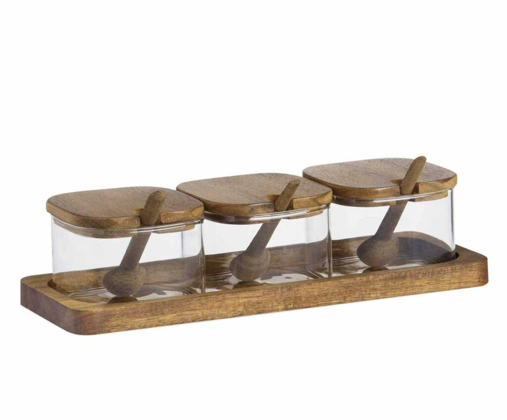 Set 3 tarros de borosilicato organizador cocina para azúcares, especias, sales, etc. Incluye 3 cucharillas de madera de acacia.