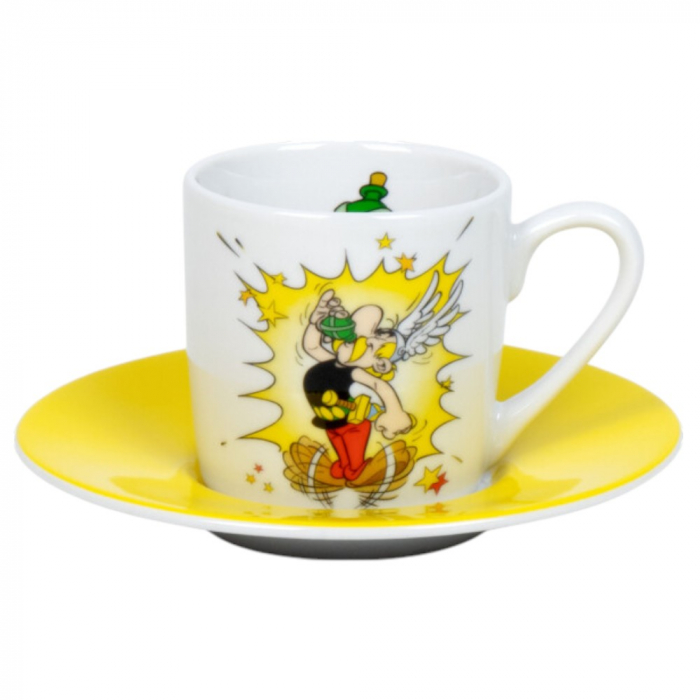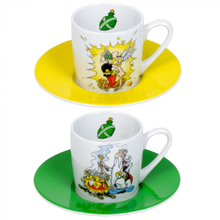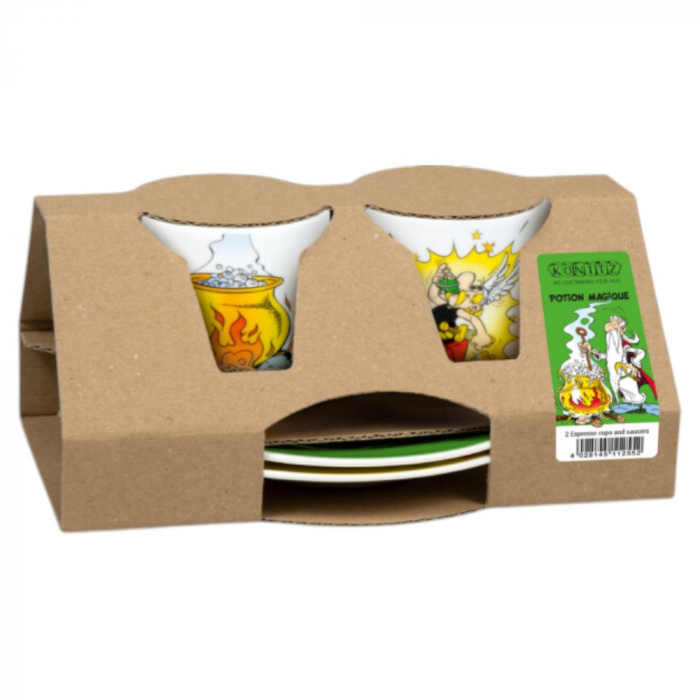 Set de 2 tazas y platillos de porcelana de alta calidad de la marca alemana Könitz Asterix y Obelix. Ideal para un regalo, compatible con microondas y lavavajillas. El desayuno será mucho más divertido si eres fan de las míticas historietas de Astérix el Galo. Poción Mágica. 85ml. Diámetro del platillo 12cm. Altura de la taza: 6cm.
