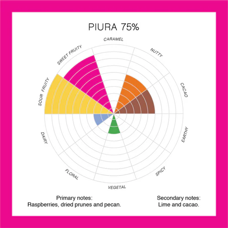 El sabor a frambuesa, lima y nueces pecanas desvela los secretos de una singular mutación botánica de la naturaleza—un delicioso cacao blanco que encontramos a lo largo del desierto costero de Perú, el hábitat de cientos de deslumbrantes mariposas.