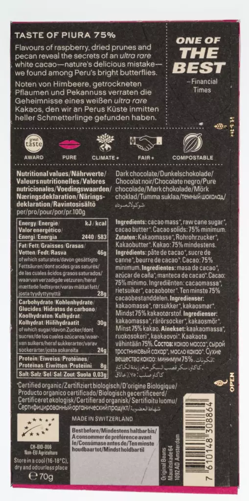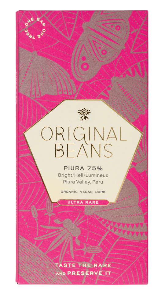 Original Beans descubrió este cacao blanco extraordinario en el valle de Piura, al norte de Perú. Dotado de un inusual suave sabor afrutado, nos propusimos volver a plantar esta variedad tan especial, que estaba a punto de extinguirse. Con los años se ha convertido en uno de los cacaos más premiados en todo el mundo. Adquirir este chocolate contribuye a proteger la población de mariposas de la región y ayuda activamente a los bosques del valle diezmados por el mal tiempo y la sequía.