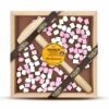 Ingredientes: 95% chocolate con LECHE (Azúcar, 24% manteca de cacao, 22,5% LECHE entera en polvo, 11% masa de cacao, emulgente: lecitina de SOJA, aroma natural de vainilla. Cacao: 33% mínimo), malvaviscos 5% (jarabe de glucosa, azúcar, dextrosa, agua, humectante: jarabe de sorbitol, gelatina, concentrados de frutas y plantas: remolacha, cártamo, aroma)