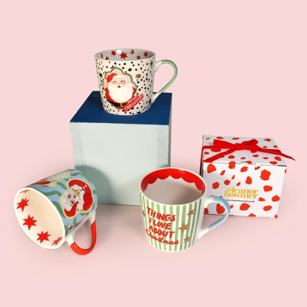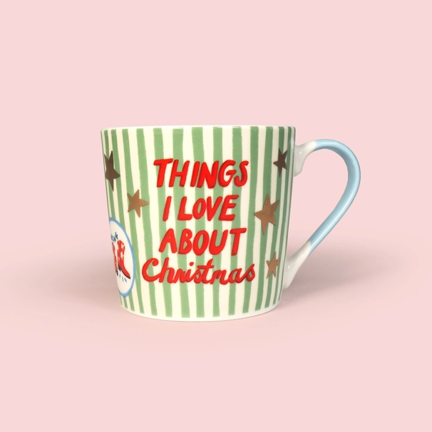 Abrígate frente al fuego con nuestra taza de diseño súper festivo Cosas que Amo de la Navidad. Esta taza de rayas verdes está decorada con ilustraciones pintadas a mano de todas nuestras actividades navideñas favoritas y adornada con estrellas de papel de oro brillante para ese toque festivo extra. Perfecta para disfrutar de tu bebida favorita en casa o para regalar a tu mejor amiga navideña.