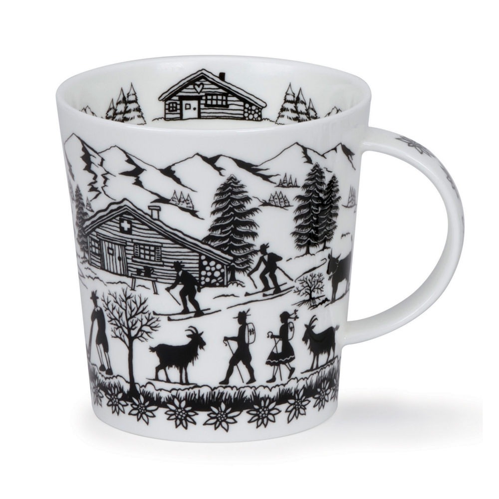 Personajes en blanco y negro disfrutan del invierno en los Alpes. Los esquiadores descienden al pueblo mientras las cabras montesas observan a los visitantes que caminan por los valles.