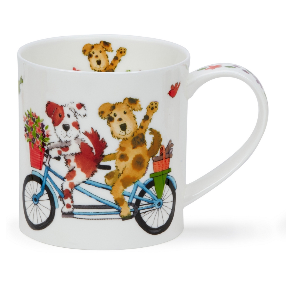 Demostrando el día perfecto, dos perros se sientan alegremente sobre su bicicleta azul brillante, con canastas de huesos y flores, mientras que en la parte posterior de la taza, un pequeño trío de perros prepara sus maletas y emprende un viaje en su brillante automóvil rojo.