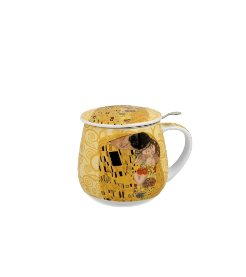 Taza barril color crudo THE KISS 430 ml con infusor y tapa inspirada en Gustav Klimt, de la serie Art Gallery , fabricada en porcelana New Bone China, caracterizada por un elegante y natural color blanco crema con un delicado brillo, además de una excepcional durabilidad.
