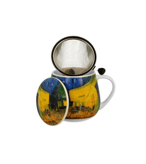 Taza barril con infusor y tapa TERRAZA DE NOCHE inspirada en V. van Gogh, parte de la serie Art Gallery , elaborada en porcelana New Bone China, caracterizada por un elegante y natural color blanco crema con un delicado brillo, además de una durabilidad excepcional.