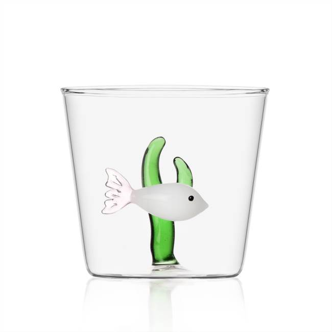 Hecho a mano en vidrio de borosilicato, presenta peces que parecen nadar en las paredes transparentes.